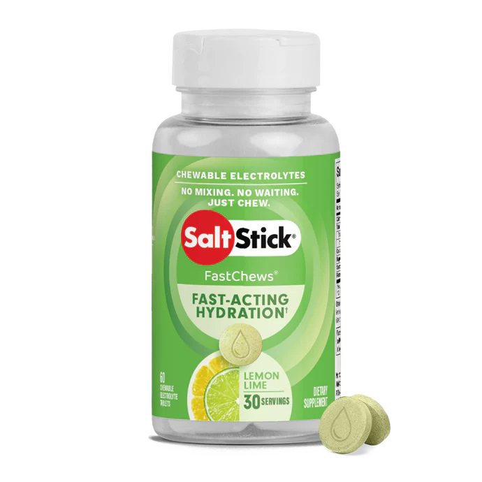 Frasco de 60 cápsulas de electrolitos masticables. Reponen rápidamente los minerales que perdemos al sudar.